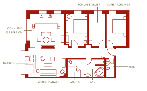 Das gemütliche Wohnzimmer mit angrenzendem Südbalkon ist mit einem Wärme spendenden Kaminofen, einem Plasma-TV und einem Internetanschluss ausgestattet. Daran schließt sich ein großzügiger Koch-/Essbereich an. Drei Schlafzimmer mit kleinen Fernsehgeräten bieten ausreichend Platz für 6 Personen (optional mit Kinderbett). Das großzügige Bad mit großer Eckwanne, Doppelwaschtisch und WC ist mit einer Sauna ausgestattet.